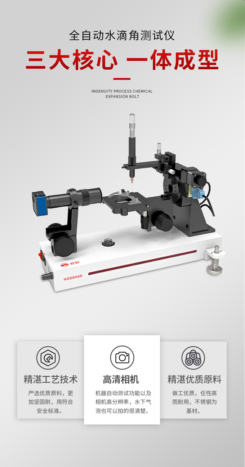 水滴角测试仪(水滴角)是指在一固体水平平面上滴一液滴,固体上的固-液-气三相交界点处,其气-液界面和固-液界面两切线把液相夹在其中时所成的角。当液滴自由地处于不受力场影响的空间时,由于界面张力的存在而呈圆球状。但是,当液滴与固体平面接触时,其最终形状取决于液滴内部的内聚力和液滴与固体间的粘附力的相对大小。当一液滴放置在固体平面上时,液滴能自动地在固体铺展开来,或以与固体成一定全自动水滴角测试仪的液滴存在。 采用光学成像的原理,设备采用图像轮廓分析方式测量样品表面接触角、润湿性能、表界面张力、前进后退角、表面能等 性能,设备采用全自动进液装置,性价比高、拓展性强、功能全面、可满足各种常规测量需求,目前已经广泛使用在众多高校院所及企业。